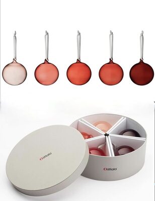 Item 199: Set of 5 Mouth-Blown Glass Balls, Donated by Deb Parliman; Brand new and come in storage box; Brand: Iitalla (Finland); Each ball has a diameter of 8 cm (about 3”) and has a hanging ribbon; Shades of red from very light to dark.